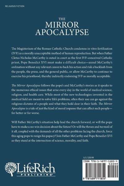 The Magisterium of the Roman Catholic Church condemns in vitro fertilization (IVF) as a morally unacceptable method of human reproduction. But when Father Cletus Nicholas McCarthy is outed in court as the first IVF-conceived Catholic priest, Pope Benedict XVI must make a difficult choice-annul McCarthy's ordination without any relevant canon to back his action and risk a backlash from the people, the press, and the general public, or allow McCarthy to continue to exercise his priesthood, thereby indirectly endorsing IVF as morally acceptable. The Mirror Apocalypse follows the pope's and McCarthy's stories as it speaks to the numerous ethical issues that arise every day in the world of medical science, religion, and health care. While most of the new technologies invented in the medical field are meant to solve life's problems, often their use can go against the religious dictates of a people and what they hold dear in their faith. The Mirror Apocalypse is a tale of just the kind of moral impasse that can affect such people-for better or for worse. Will Father McCarthy's situation help lead the church forward, or will the pope have to make a no-win decision about the future? Or will the throes and turmoil of it all, coupled with the demands of all the other problems facing the church, force this aging pope to resign his papacy? Join Father McCarthy and Pope Benedict XVI as they stand at the intersection of science, morality, and faith.