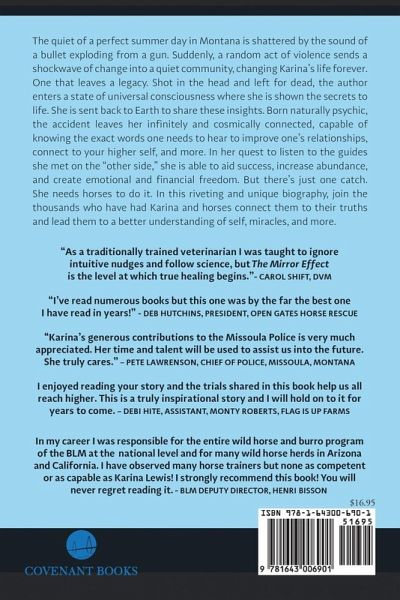 The quiet of a perfect summer day in Montana is shattered by the sound of a bullet exploding from a gun. Suddenly, a random act of violence sends a shockwave of change into a quiet community, changing Karina’s life forever. One that leaves a legacy. Shot in the head and left for dead, the author enters a state of universal consciousness where she is shown the secrets to life. She is sent back to Earth to share these insights. Born naturally psychic, the accident leaves her infinitely and cosmically connected, capable of knowing the exact words one needs to hear to improve one’s relationships, connect to your higher self, and more. In her quest to listen to the guides she met on the "other side," she is able to aid success, increase abundance, and create emotional and financial freedom. But there’s just one catch. She needs horses to do it. In this riveting and unique biography, join the thousands who have had Karina and horses connect them to their truths and lead them to a better understanding of self, miracles, and more.