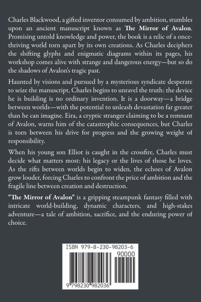 Charles Blackwood, a gifted inventor consumed by ambition, stumbles upon an ancient manuscript known as The Mirror of Avalon. Promising untold knowledge and power, the book is a relic of a once-thriving world torn apart by its own creations. As Charles deciphers the shifting glyphs and enigmatic diagrams within its pages, his workshop comes alive with strange and dangerous energy-but so do the shadows of Avalon's tragic past. Haunted by visions and pursued by a mysterious syndicate desperate to seize the manuscript, Charles begins to unravel the truth: the device he is building is no ordinary invention. It is a doorway-a bridge between worlds-with the potential to unleash devastation far greater than he can imagine. Eira, a cryptic stranger claiming to be a remnant of Avalon, warns him of the catastrophic consequences, but Charles is torn between his drive for progress and the growing weight of responsibility. When his young son Elliot is caught in the crossfire, Charles must decide what matters most: his legacy or the lives of those he loves. As the rifts between worlds begin to widen, the echoes of Avalon grow louder, forcing Charles to confront the price of ambition and the fragile line between creation and destruction. "The Mirror of Avalon" is a gripping steampunk fantasy filled with intricate world-building, dynamic characters, and high-stakes adventure-a tale of ambition, sacrifice, and the enduring power of choice.