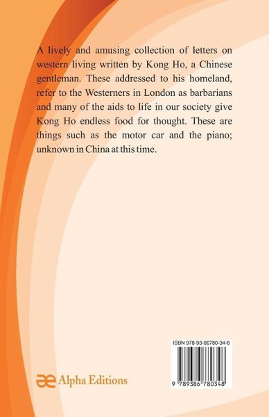 A lively and amusing collection of letters on western living written by Kong Ho, a Chinese gentleman. These addressed to his homeland, refer to the Westerners in London as barbarians and many of the aids to life in our society give Kong Ho endless food for thought. These are things such as the motor car and the piano; unknown in China at this time.