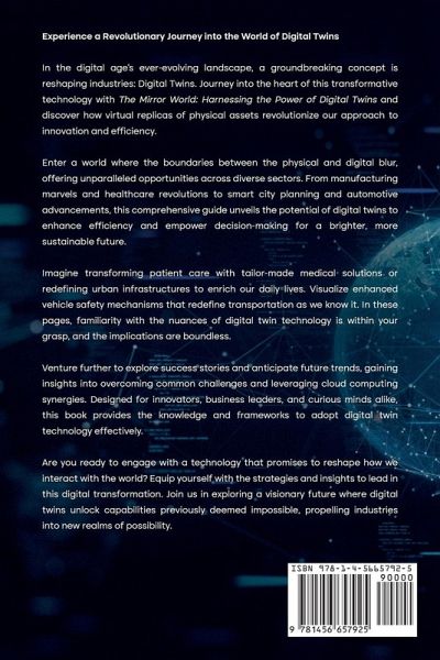 Experience a Revolutionary Journey into the World of Digital Twins In the digital age's ever-evolving landscape, a groundbreaking concept is reshaping industries: Digital Twins. Journey into the heart of this transformative technology with The Mirror World: Harnessing the Power of Digital Twins and discover how virtual replicas of physical assets revolutionize our approach to innovation and efficiency. Enter a world where the boundaries between the physical and digital blur, offering unparalleled opportunities across diverse sectors. From manufacturing marvels and healthcare revolutions to smart city planning and automotive advancements, this comprehensive guide unveils the potential of digital twins to enhance efficiency and empower decision-making for a brighter, more sustainable future. Imagine transforming patient care with tailor-made medical solutions or redefining urban infrastructures to enrich our daily lives. Visualize enhanced vehicle safety mechanisms that redefine transportation as we know it. In these pages, familiarity with the nuances of digital twin technology is within your grasp, and the implications are boundless. Venture further to explore success stories and anticipate future trends, gaining insights into overcoming common challenges and leveraging cloud computing synergies. Designed for innovators, business leaders, and curious minds alike, this book provides the knowledge and frameworks to adopt digital twin technology effectively. Are you ready to engage with a technology that promises to reshape how we interact with the world? Equip yourself with the strategies and insights to lead in this digital transformation. Join us in exploring a visionary future where digital twins unlock capabilities previously deemed impossible, propelling industries into new realms of possibility.