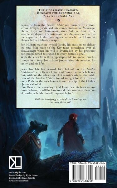 The tides have changed. Beneath the burning-sea, a voice is calling. Who will follow it? Separated from the Lawless Child and pursued by a monstrous Ki’rayh, Jarvis and his companions—the Messenger Hunter Titus and Kattamont prince Aaldryn, host to the volatile wind-god, Khamsin—are in a desperate race across the expanses of the burning-sea to reach the House of Flames before Coltarian erupts. For Human-machine hybrid Jarvis, his mission to deliver the vital Map-piece to the Key takes precedence over all else…except when his will is overridden by his protector bot, programmed to respond to every distress signal. With the cries from the deep impossible to ignore, can his companions keep Jarvis from jeopardising his mission, his sanity, and his life? Jarvis has left his beloved Ki’b behind on the Lawless Child—safe with Denvy, Clive, and Penny…or so he believes. But, without the advantage of Khamsin’s winds, the misfit crew of the Lawless Child is forced to fight for their lives as every Pride in the area homes in on the ship of the Outlaw Queen Zafiashid. Can Denvy, the legendary Gold Lion, face his fears to save those he loves, or will he have to add their names to the scores of deaths he holds himself responsible for? Will the terrifying secrets of the burning-sea consume them all?