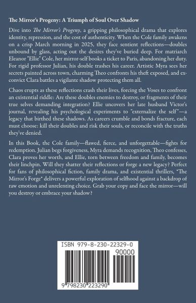 The Mirror's Progeny: A Triumph of Soul Over Shadow Dive into The Mirror's Progeny, a gripping philosophical drama that explores identity, repression, and the cost of authenticity. When the Cole family awakens on a crisp March morning in 2025, they face sentient reflections-doubles unbound by glass, acting out the desires they've buried deep. For matriarch Eleanor "Ellie" Cole, her mirror-self books a ticket to Paris, abandoning her duty. For rigid professor Julian, his double trashes his career. Artistic Myra sees her secrets painted across town, charming Theo confronts his theft exposed, and ex-convict Clara battles a vigilante shadow protecting them all. Chaos erupts as these reflections crash their lives, forcing the Voses to confront an existential riddle: Are these doubles enemies to destroy, or fragments of their true selves demanding integration? Ellie uncovers her late husband Victor's journal, revealing his psychological experiments to "externalize the self"-a legacy that birthed these shadows. As careers crumble and bonds fracture, each must choose: kill their doubles and risk their souls, or reconcile with the truths they've denied. In this Book, the Cole family-flawed, fierce, and unforgettable-fights for redemption. Julian begs forgiveness, Myra demands recognition, Theo confesses, Clara proves her worth, and Ellie, torn between freedom and family, becomes their linchpin. Will they shatter their reflections or forge a new legacy? Perfect for fans of philosophical fiction, family drama, and existential thrillers, *The Mirror's Forge* delivers a powerful exploration of selfhood against a backdrop of raw emotion and unrelenting choice. Grab your copy and face the mirror-will you destroy or embrace your shadow?