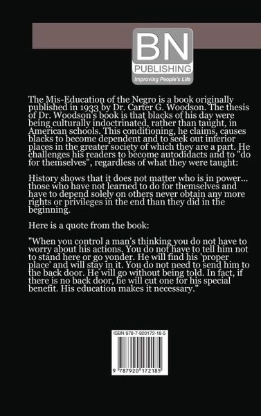 The Mis-Education of the Negro is a book originally published in 1933 by Dr. Carter G. Woodson. The thesis of Dr. Woodson's book is that blacks of his day were being culturally indoctrinated, rather than taught, in American schools. This conditioning, he claims, causes blacks to become dependent and to seek out inferior places in the greater society of which they are a part. He challenges his readers to become autodidacts and to "do for themselves", regardless of what they were taught: History shows that it does not matter who is in power... those who have not learned to do for themselves and have to depend solely on others never obtain any more rights or privileges in the end than they did in the beginning. Here is a quote from the book: "When you control a man's thinking you do not have to worry about his actions. You do not have to tell him not to stand here or go yonder. He will find his 'proper place' and will stay in it. You do not need to send him to the back door. He will go without being told. In fact, if there is no back door, he will cut one for his special benefit. His education makes it necessary."