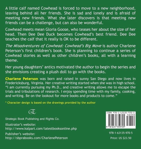 A little calf named Cowhead is forced to move to a new neighborhood, leaving behind all her friends. She is sad and lonely and is afraid of meeting new friends. What she later discovers is that meeting new friends can be a challenge, but can also be wonderful. Cowhead meets mean Gloria Goose, who teases her about the size of her head. Then Dee Dee Duck becomes Cowhead's best friend. Dee Dee teaches the calf that it really is OK to be different. The Misadventures of Cowhead: Cowhead's Big Move is author Charlene Peterson's first children's book. She is planning to continue a series of Cowhead…mehr