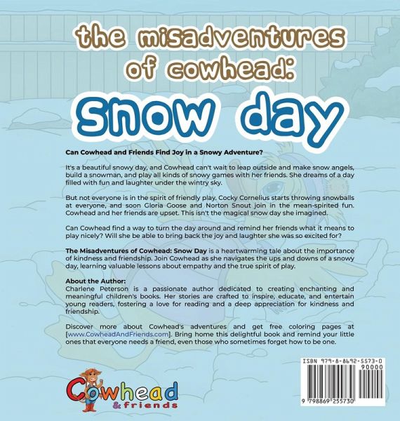The Misadventures of Cowhead: Snow Day by Charlene Peterson The book appears to be a children's story about a young girl named Cowhead who wakes up to find snow covering the ground. Excited, she rushes to go outside and play with her friends, Dee Dee Duck and others. They build a snowman, but it gets ruined by a boy named Cocky Cornelius, who causes trouble. After a brief conflict, Cowhead's mother, Momma Cow, teaches her the importance of kindness and compassion. Despite Cocky Cornelius's behavior, Cowhead brings him a cup of hot cocoa, and he joins the group inside for a warm drink, turning what started as a difficult situation into a friendly one. The story ends on a positive note with everyone enjoying their hot cocoa and cookies together while watching the snow fall. The story highlights themes of empathy, forgiveness, and friendship.