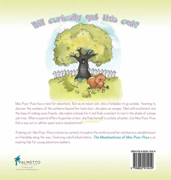 When curiosity gets the best of an indoor cat, she ends up in a pickle. Can this adventurous feline find a way out? An indoor cat can hardly complain...life is filled with naps on sunny windowsills and cozy hearths, three meals a day, and endless scratches behind the ears. But Miss Puss-Puss has a mind for adventure. And long has she yearned to experience the great outdoors, watching birds, climbing trees, and making friends. Having made up her mind to escape, nothing can stop her. Join Miss Puss-Puss on her quest for excitement and the possibility of meeting a friend or two. In The Misadventures of Miss Puss-Puss, Miss Puss-Puss has been forbidden to go outside. But her desire to explore the world beyond her back door propels her to new heights. But will her adventure be a success or end in misadventure? After making a break for it, she finds a moment to rest in the shade of a large oak tree. But Miss Puss-Puss isn't the only one who uses the tree for shelter. Could it be the friend she hoped for? And when she finds herself in sticky situation, she'll need all the help she can get. Written for elementary kids, this delightful tale of a daring cat fosters curiosity and illustrates the importance of friendship.