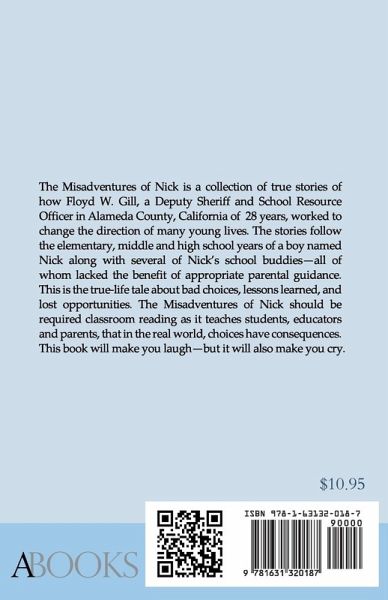 The Misadventures of Nick is a collection of true stories of how Floyd W. Gill, a Deputy Sheriff and School Resource Officer in Alameda County, California of 28 years, worked to change the direction of many young lives. The stories follow the elementary, middle and high school years of a boy named Nick along with several of Nick's school buddies-all of whom lacked the benefit of appropriate parental guidance. This is the true-life tale about bad choices, lessons learned, and lost opportunities. The Misadventure of Nick should be required classroom reading as it teaches students, educators and parents, that in the real world, choices have consequences. This book will make you laugh-but it will also make you cry.