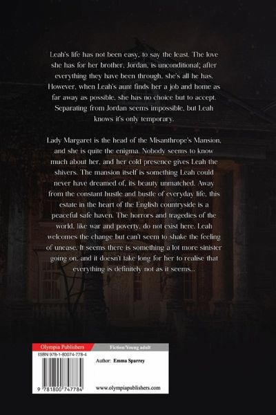 Leah's life has not been easy, to say the least. The love she has for her brother, Jordan, is unconditional; after everything they have been through, she's all he has. However, when Leah's aunt finds her a job and home as far away as possible, she has no choice but to accept. Separating from Jordan seems impossible, but Leah knows it's only temporary. Lady Margaret is the head of the Misanthrope's Mansion, and she is quite the enigma. Nobody seems to know much about her, and her cold presence gives Leah the shivers. The mansion itself is something Leah could never have dreamed of, its beauty unmatched. Away from the constant hustle and bustle of everyday life, this estate in the heart of the English countryside is a peaceful safe haven. The horrors and tragedies of the world, like war and poverty, do not exist here. Leah welcomes the change but can't seem to shake the feeling of unease. It seems there is something a lot more sinister going on, and it doesn't take long for her to realise that everything is definitely not as it seems...