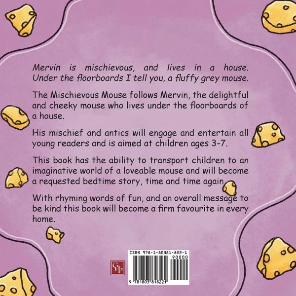 Mervin is mischievous, and lives in a house. Under the floorboards I tell you, a fluffy grey mouse. The Mischievous Mouse follows Mervin, the delightful and cheeky mouse who lives under the floorboards of a house. His mischief and antics will engage and entertain all young readers and is aimed at children ages 3-7. This book has the ability to transport children to an imaginative world of a loveable mouse and will become a requested bedtime story, time and time again. With rhyming words of fun and games and an overall message to be kind this book will become a firm favourite in every home.
