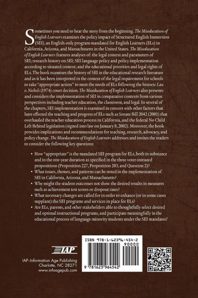 The Miseducation of English Learners examines the initial policy impact of Structured English Immersion (SEI), an English-only program mandated for English Learners (ELs) in California, Arizona, and Massachusetts in the United States. The book features analyses of: the legal context and parameters of SEI; research history on SEI; SEI language policy and policy implementation according to situated context; and the educational priorities and legal rights of ELs. The book examines the history of SEI in the educational research literature and as it has been interpreted in the context of the legal requirement for schools to take "appropriate action" to meet the needs of ELs following the historic Lau v. Nichols (1974) court decision. The Miseducation of English Learners also presents and considers the implementation of SEI in comparative contexts from various perspectives including teacher education, the classroom, and legal. In several of the chapters, SEI implementation is examined in concert with other factors that have effected the teaching and progress of ELs such as Senate Bill 2042 (2001) that overhauled the teacher education process in California, and the federal No Child Left Behind legislation (signed into law on January 8, 2002). Moreover, the book provides implications and recommendations for teaching, research, advocacy, and policy change. The Miseducation of English Learners addresses and invites the readers to consider the following key questions: ¿ How "appropriate" is the mandated SEI program for ELs, both in substance and in the one-year duration as specified in the three voter-initiated propositions (Proposition 227, Proposition 203, and Question 2)? ¿ What issues, themes, and patterns can be noted in the implementation of SEI in California, Arizona, and Massachusetts? ¿ Why might the student outcomes not show the desired results in measures such as achievement test scores or dropout rates? ¿ What necessary changes are called for in order to enhance (or in some cases supplant) the SEI programs and services in place for ELs? ¿ Are ELs, parents, and other stakeholders able to thoughtfully select desired and optimal instructional programs, and participate meaningfully in the educational process of language minority students under the SEI mandates?