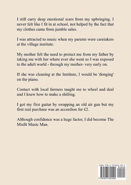 I still carry deep emotional scars from my upbringing. I never felt like I fit in at school, not helped by the fact that my clothes came from jumble sales. I was attracted to music when my parents were caretakers at the village institute. My mother felt the need to protect me from my father by taking me with her where ever she went so I was exposed to the adult world - through my mother- very early on. If she was cleaning at the Institute, I would be 'donging' on the piano. Contact with local farmers taught me to wheel and deal and I knew how to make a shilling. I got my first guitar by swapping an old air gun but my first real purchase was an accordion for £2. Although confidence was a huge factor, I did become The Misfit Music Man.