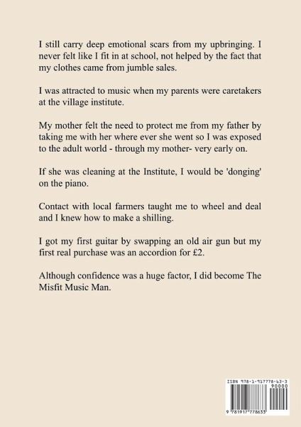 I still carry deep emotional scars from my upbringing. I never felt like I fit in at school, not helped by the fact that my clothes came from jumble sales. I was attracted to music when my parents were caretakers at the village institute. My mother felt the need to protect me from my father by taking me with her where ever she went so I was exposed to the adult world - through my mother- very early on. If she was cleaning at the Institute, I would be 'donging' on the piano. Contact with local farmers taught me to wheel and deal and I knew how to make a shilling. I got my first guitar by swapping an old air gun but my first real purchase was an accordion for £2. Although confidence was a huge factor, I did become The Misfit Music Man.