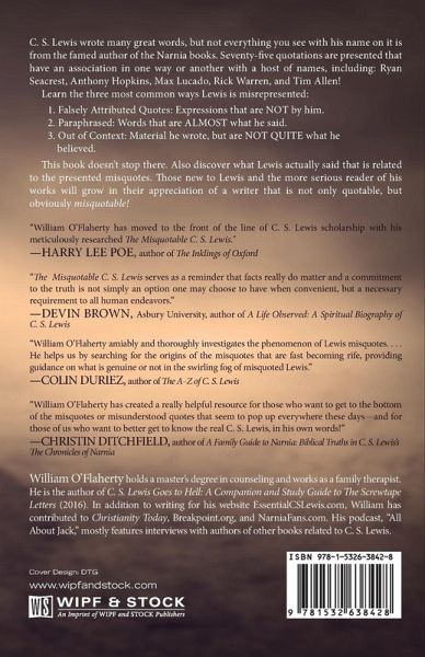 C.S. Lewis wrote many great words, but not everything you see with his name on it is from the famed author of the Narnia books. Seventy-five quotations are presented that have an association in one way or another with a host of names, including: Ryan Seacrest, Anthony Hopkins, Max Lucado, Rick Warren, and Tim Allen! Learn the three most common ways Lewis is misrepresented: 1.Falsely Attributed Quotes: Expressions that are NOT by him. 2.Paraphrased: Words that are ALMOST what he said. 3.Out of Context: Material he wrote, but are NOT QUITE what he believed. This book doesn't stop there. Also discover what Lewis actually said that is related to the presented misquotes. Those new to Lewis and the more serious reader of his works will grow in their appreciation of a writer that is not only quotable, but obviously misquotable!
