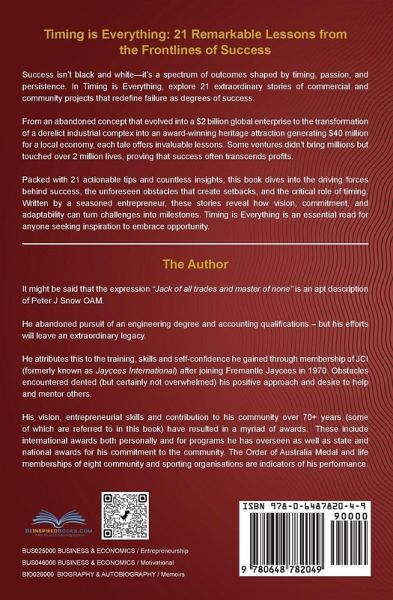 Timing is Everything: 21 Unforgettable Lessons from the Entrepreneurial Frontlines Success isn't black or white-it's a spectrum shaped by passion, commitment, and the ticking clock of opportunity. In Timing is Everything, journey through the captivating stories of 21 commercial and community projects that prove there's no such thing as failure-only degrees of success. From an abandoned idea now valued at $2 billion globally, to the transformation of a derelict industrial site into an award-winning heritage attraction that infused $40 million into the local economy, each tale offers a rich tapestry of lessons and inspiration. While some ventures didn't yield massive profits, they profoundly impacted over 2 million lives, demonstrating that true success often lies beyond the balance sheet. Discover the driving forces that propel projects forward, the unforeseen obstacles that create fatal flaws, and the crucial role timing plays in every endeavour. Gain 21 actionable tips-plus countless hard-earned insights-from a pioneering entrepreneur who's been in the trenches of both commerce and community. Whether you're a budding entrepreneur, a seasoned leader, or someone seeking inspiration to tackle challenges, Timing is Everything reveals the delicate dance between preparation, perseverance, and the serendipity of the right moment.
