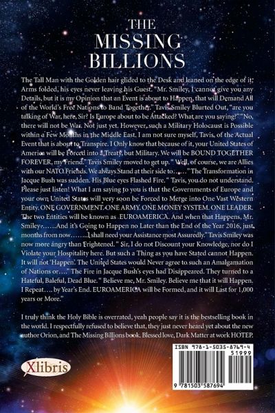"The Tall Man with the Golden hair glided to the Desk and leaned on the edge of it, Arms folded, his eyes never leaving his Guest. ""Mr. Smiley, I cannot give you any Details, but it is my Opinion that an Event is about to Happen, that will Demand All of the World's Free Nations to Band Together."" Tavis Smiley Blurted Out, ""are you talking of War, here, Sir? Is Europe about to be Attacked? What are you saying?"" ""No, there will not be War. Not just yet. However, such a Military Holocaust is Possible within a Few Months in the Middle East. I am not sure myself, Tavis, of the Actual Event that is about to Transpire. I Only know that because of it, your United States of America will be Forced into a Treaty, but Military. We will be BOUND TOGETHER FOREVER, my Friend."" Tavis Smiley moved to get up. "" Well, of course, we are Allies with our NATO Friends. We always Stand at their side to..."" The Transformation in Jacque Bush was sudden. His Blue eyes Flashed Fire. "" Tavis, you do not understand. Please just listen! What I am saying to you is that the Governments of Europe and your own United States will very soon be Forced to Merge into One Vast Western Entity. ONE GOVERNMENT. ONE ARMY. ONE MONEY SYSTEM. ONE LEADER. The two Entities will be known as EUROAMERICA. And when that Happens, Mr. Smiley...And it's Going to Happen no Later than the End of the Year 2016, just months from now...I shall need your Assistance most Assuredly."" Tavis Smiley was now more angry than Frightened. "" Sir, I do not Discount your Knowledge, nor do I Violate your Hospitality here. But such a Thing as you have Stated cannot Happen. It will not 'Happen'. The United States would Never agree to such an Amalgamation of Nations or¿."" The Fire in Jacque Bush's eyes had Disappeared. They turned to a Hateful, Baleful, Dead Blue. "" Believe me, Mr. Smiley. Believe me that it will Happen. I Repeat... by Year's End. EUROAMERICA will be Formed, and it will Last for 1,000 years or More."" I truly think the Holy Bible is overrated, yeah people say it is the bestselling book in the world. I respectfully refused to believe that, they just never heard yet about the new author Orion, and The Missing Billions book. Blessed love, Dark Matter at work HOTEP."