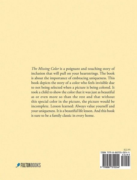 The Missing Color is a poignant and touching story of inclusion that will pull on your heartstrings. The book is about the importance of embracing uniqueness. This book depicts the story of a color who feels invisible due to not being selected when a picture is being colored. It took a child to show the color that it was just as beautiful as or even more so than the rest and that without this special color in the picture, the picture would be incomplete. Lesson learned: Always value yourself and your uniqueness. It is a beautiful life lesson. And this book is sure to be a family classic in every home.