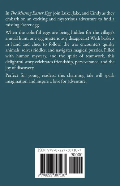 In The Missing Easter Egg, join Luke, Jake, and Cindy as they embark on an exciting and mysterious adventure to find a missing Easter egg. When the colorful eggs are being hidden for the village's annual hunt, one egg mysteriously disappears! With baskets in hand and clues to follow, the trio encounters quirky animals, solves riddles, and navigates magical puzzles. Filled with humor, mystery, and the spirit of teamwork, this delightful story celebrates friendship, perseverance, and the joy of discovery. Perfect for young readers, this charming tale will spark imagination and inspire a love for adventure.