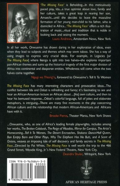 "'The Missing Face' is Beholding...In this meticulously paced play, Ida...a true optimist about love, family and her culture, takes a great leap in rearing her son, Amaechi...until she decides to leave the masculine formation of her young man-child to his father, who is domiciled in Africa...'The Missing Face' offers a rich illustration of music...ritual and tradition that is noble in looking back and seizing the moment."- ?Laura Andrews, Amsterdam News, New York?? ??"The Missing Face has many interesting characters and proactive ideas...The conflict between Ida and Odozi is refreshing and funny; it's fascinating to see and hear an African-American lecture an African about...[his] own culture, and then to hear his bemused response...Odozi's colorful language, full of jokes and elaborate metaphors, is intriguing...There are many fine moments in the play concerning African culture and the relationship that modern African-Americans and Africans have with it."?- Nrooke Pierce, Theater Mania, New York Show "In all her work, Onwueme has shown daring in her exploration of ideas, even when they lead to subjects and themes which may seem taboo. She has a way of using images to express very crucial ideas. For example, in Legacies [or The Missing Face] where lkenga is split into two halves-she explores important pan-African themes and sums up the historical tragedy of the first major division of Africa into continental and diasporan entities. Wholeness will come when the two halves come together."- ?Ngugi wa Thiong'o, foreword to Onwueme's Tell It To Women