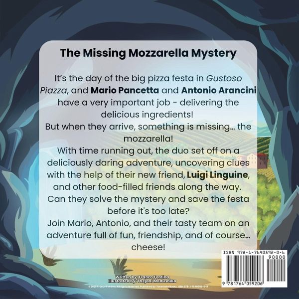 The Adventures of Mario Pancetta and Antonio Arancini: The Missing Mozzarella Mystery It's the day of the big pizza festa in Gustoso Piazza, and Mario Pancetta and Antonio Arancini have a very important job - delivering the delicious ingredients! But when they arrive, something is missing... the mozzarella! With time running out, Mario and Antonio set off on a deliciously daring adventure, uncovering clues with the help of their new friend, Luigi Linguine, and other food-filled friends along the way. Can they solve the mystery and save the festa before it's too late? The Missing Mozzarella Mystery is a fun-filled children's story bursting with humour, teamwork, and the magic of a good meal. Perfect for young readers aged 4-8 who love food, funny mysteries, and lively, full-colour illustrations. Join Mario, Antonio, and their tasty team on an unforgettable adventure - full of fun, friendship, and of course... cheese!