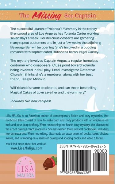 The successful launch of Yolanda's Yummery in the trendy Brentwood area of Los Angeles has Yolanda Carter working seven days a week. Her delicious desserts are garnering many repeat customers and in just a few weeks the adjoining Beverage Bar will be opening. She's involved in a budding romance with sophisticated British tea baron, Nigel Garvey. The mystery involves Captain Angus, a regular homeless customer who disappears. Clues point toward Yolanda being involved in foul play. Lead investigator Detective Churchill thinks she's a murderer, along with her best friend, Teagan Mishkin. Will Yolanda's name be cleared, and can those bestselling Magical Cakes of Love save her and the yummery? Includes two new recipes!