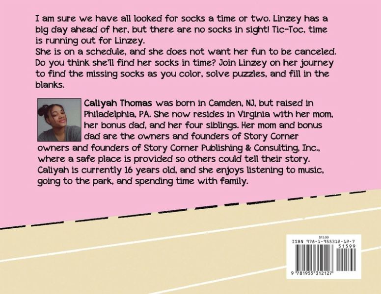 I am sure we have all looked for socks a time or two. Linzey has a big day ahead of her, but there are no socks in sight! Tic-Toc, time is running out for Linzey. She is on a schedule, and she does not want her fun to be canceled. Do you think she'll find her socks in time? Join Linzey on her journey to find the missing socks as you color, solve puzzles, and fill in the blanks.