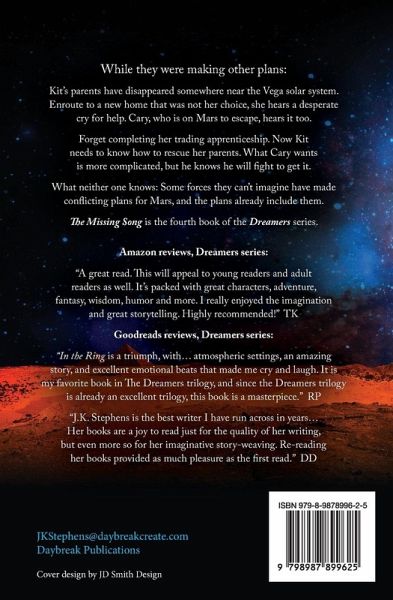 In the early days of space exploration -- a time when new technologies mingle with the echoes of legendary civilizations, and new freedoms cross swords with old tyrannies -- a missing song becomes a critical link in an ancient struggle. Kit's parents have disappeared somewhere near the Vega solar system. On the way to a new home that was not her choice, she hears a desperate cry for help. Cary, who is on Mars to escape, hears it too. Forget completing her trading apprenticeship. Now Kit needs to know how to rescue her parents. What Cary seeks is more complicated, but he knows he will fight to get it. What neither one knows: Some forces they can't imagine have made conflicting plans for Mars, and the plans already include them. The Missing Song is the fourth book in the Dreamers series.
