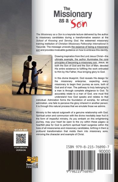 The Missionary as a Son is a keynote lecture delivered by the author to missionary candidates during a transformative session at the School of Knowing and Serving God, the esteemed missionary training institution of Christian Missionary Fellowship International The message unravels the essence of being a missionary son and provides invaluable guidance on how to embrace and put on this identity. Drawing inspiration from the Lord Jesus Christ-the ultimate example-the author illuminates the core principles of becoming a missionary son. Jesus, as both the Son of God and the Son of Man, devoted His entire existence to accomplishing the work entrusted to Him by His Father, thus bringing glory to God. In this divine blueprint, God reveals His design for the missionary enterprise, thus, He expects every missionary to begin their journey as sons, both of God and of man. The pathway to truly belong to a man is through complete allegiance to God. To accurately relate to a man of God, one must first understand how God speaks and relates to that individual. Admiration forms the foundation of sonship; for without admiration, one fails to perceive the glory indwelling in another person. It is through this natural process that we emulate those we admire. Ministry is the natural overflow of a genuine relationship with God. Spiritual union and communion with the Divine inevitably bear fruit in the form of impactful ministry. As you embark on this enlightening and transformative journey, may your heart be open to the cry enshrined in these pages-a heartfelt plea for God to perform spiritual heart surgeries in the lives of all missionaries and missionary candidates, birthing in them a profound transformation that molds them into missionary sons, mirroring the character and example of Christ.