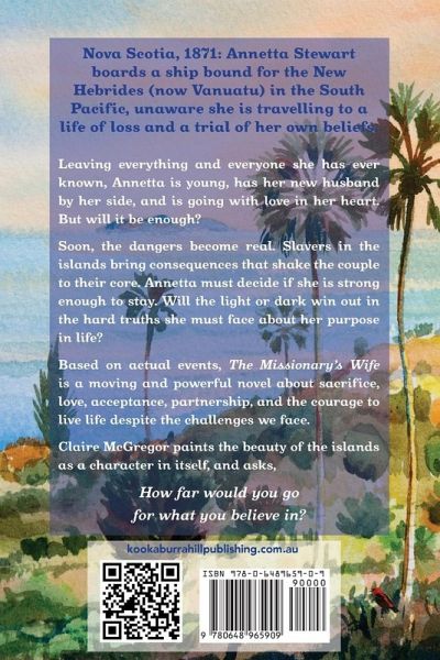 Nova Scotia, 1871: Annetta Stewart boards a ship bound for the New Hebrides (now Vanuatu) in the South Pacific, unaware she is travelling to a life of loss and a trial of her own beliefs. Leaving everything and everyone she has ever known, Annetta is young, has her new husband by her side, and is going with love in her heart. But will it be enough? Soon, the dangers become real. The actions of slavers in the islands bring consequences that shake the couple to their core. Annetta must decide if she is strong enough to stay. Will the light or dark win out in the hard truths she must face about her faith and purpose in life? Based on actual events, The Missionary's Wife is a moving and powerful novel about sacrifice, love, acceptance, partnership, and the courage to live life despite the challenges we face.Claire McGregor shows the beauty of the islands as a character in itself, and asks, How far would you go for what you believe in?