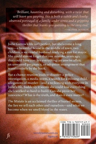 Jodie Garrow's life isn't perfect, but she's come a long way-a beautiful house in the middle of town, two children, a successful husband readying a run for mayor. She could almost forget that one mistake, years ago, that could have cost her everything: an unwise affair, an unwanted pregnancy, an adoption arrangement that wasn't entirely by the book. But a chance reunion leads to disaster: a police investigation, a media storm, a search for a missing child, allegations of murder-and a reckoning with everyone in Jodie's life. Suddenly it seems she could lose everything she's worked so hard to build. Can she prove her innocence? What is the truth, and does it even matter? The Mistake is an acclaimed thriller of buried secrets, the lies we tell each other and ourselves-and what we become when we smell blood in the water.