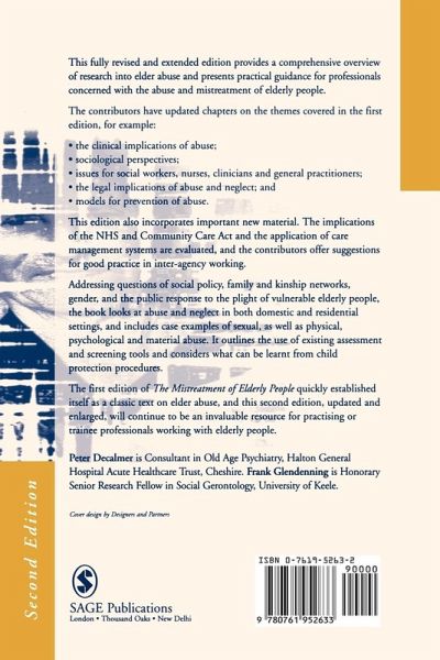 `The edited collection by Decalmer and Glendenning is a revised and expanded version of their previous successful collection of readings. It includes a number of perspectives and different disciplines. It is therefore a welcome addition to the literature as it provides a much needed overview of the major research, theoretical and professional perspectives on the topic....The Decalmer and Glendenning text is useful in increasing awareness, knowledge and understanding about elder abuse and neglect and should, as the first edition did, attract a wide readership' - Ageing and Society `This welcome second edition has been expanded by eight chapters, balancing , as the editors state, theory and good practice....Many of the contributers are well known in the field; newer names bring new perspectives and will hopefully continue their interest in this increasingly complex and expanding knowledge base. The editors have co-ordinated a fairly balanced read. The book consolidates its position as one of the standard reference texts on the subject and also includes many unique, well-written sections on ineteresting facets of abuse of older people' - Age and Ageing