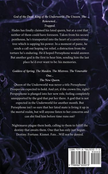 God of the Dead. King of the Underworld. The Unseen. The Renowned... Trapped. Hades has finally claimed his fated queen, but at a cost that neither of them could have foreseen. Taken from his secure penthouse, he's transported into the heart of a carnivorous tree which is sapping his power. In a moment of panic, he sends a call out hoping for relief, a distraction from the torture he's enduring. He'd hoped Persephone would answer. But another god is the first to hear him, sending him the last place he'd ever want to be: his memories. Goddess of Spring. The Maiden. The Mistress. The Venerable One... The New Queen. Queen of the Underworld was never a title Persephone Prosperina expected to hold. And yet, if the crown fits, right? Perspephone is plunged into her new role, feeling completely unsupported by the god that put her there. A god that is not expected in the Underworld for another month. But Persephone isn't so sure that her fated mate is living it up in the mortal realm, but will anyone listen to her concerns and can she find him before time runs out? Nightmares plague them both, calling to them to fulfill the destiny that awaits them. One that has only just begun. Destiny. Fortune. Kismet. Fate...Will not be denied.