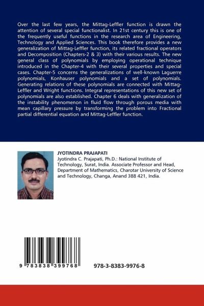 Over the last few years, the Mittag-Leffler function is drawn the attention of several special functionalist. In 21st century this is one of the frequently useful functions in the research area of Engineering, Technology and Applied Sciences. This book therefore provides a new generalization of Mittag-Leffler function, its related fractional operators and Decomposition (Chapters-2 & 3) with their various results. The new general class of polynomials by employing operational technique introduced in the Chapter-4 with their several properties and special cases. Chapter-5 concerns the generalizations of well-known Laguerre polynomials, Konhauser polynomials and a set of polynomials. Generating relations of these polynomials are connected with Mittag-Leffler and Wright functions. Integral representations of this new set of polynomials are also established. Chapter 6 deals with generalization of the instability phenomenon in fluid flow through porous media with mean capillary pressureby transforming the problem into Fractional partial differential equation and Mittag-Leffler function.