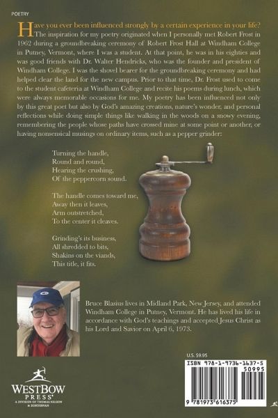 Have you ever been influenced strongly by a certain experience in your life? The inspiration for my poetry originated when I personally met Robert Frost in 1962 during a groundbreaking ceremony of Robert Frost Hall at Windham College in Putney, Vermont, where I was a student. At that point, he was in his eighties and was good friends with Dr. Walter Hendricks, who was the founder and president of Windham College. I was the shovel bearer for the groundbreaking ceremony and had helped clear the land for the new campus. Prior to that time, Dr. Frost used to come to the student cafeteria at Windham College and recite his poems during lunch, which were always memorable occasions for me. My poetry has been influenced not only by this great poet but also by Gods amazing creations, natures wonder, and personal reflections while doing simple things like walking in the woods on a snowy evening, remembering the people whose paths have crossed mine at some point or another, or having nonsensical musings on ordinary items, such as a pepper grinder: Turning the handle, Round and round, Hearing the crushing, Of the peppercorn sound. The handle comes toward me, Away then it leaves, Arm outstretched, To the center it cleaves. Grindings its business, All shredded to bits, Shakins on the viands, This title, it fits.