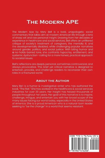 The Modern Ape by Mary Bell is a bold, unapologetic social commentary that takes aim at modern American life through a lens of sharp wit and raw personal insight. Drawing from her decades of experience in healthcare and social services, Bell offers an unfiltered critique of society's treatment of caregivers, the mentally ill, and the developmentally disabled, while challenging popular narratives around gender, politics, and social justice. With biting humor and a a no-holds-barred tone, she confronts hypocrisy, entitlement, and systemic dysfunction-calling for a more honest, practical approach to societal issues. Bell' s reflections are deeply personal, sometimes controversial, and always provocative. This brief yet critical narrative is designed to entertain, provoke, and challenge readers to reconsider their own roles in a fractured world.