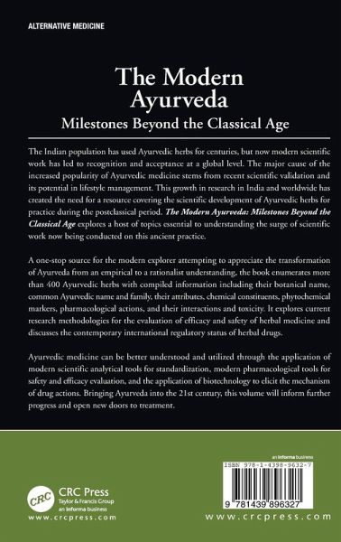 The Indian population has used Ayurvedic herbs for centuries, but now modern scientific work has led to recognition and acceptance at a global level. This volume explores a host of topics essential to understanding this ancient practice. The book enumerates more than 400 Ayurvedic herbs with compiled information including their botanical name, common Ayurvedic name and family, their attributes, chemical constituents, phytochemical markers, pharmacological actions, and their interactions and toxicity. It explores current research methodologies for the evaluation of efficacy and safety of herbal medicine and discusses the contemporary international regulatory status of herbal drugs.
