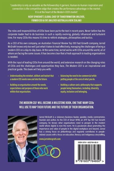 The roles and responsibilities of CEOs have been put to the test in recent years. Never before has the corporate leader had to do business in such a rapidly evolving, globally influenced and turbulent time. For many CEOs this means it's time to rethink strategies, philosophies and tactics. As a CEO of his own company, an Australian Financial Review Top 100 Fast Growth company, Jarrod McGrath knows only too well just what it takes to lead effectively, managing the challenges of being a modern CEO on a day-to-day basis. At the same time, Jarrod works with CEOs around the world, all of whom are facing the same issues. It has become clear that a fresh approach to leading organisations is needed. With the input of leading CEOs from around the world, and extensive research on the changing roles of CEOs and the challenges and opportunities they face, The Modern CEO is an inspirational and practical guide. This book will help you with: Understanding the mindset, skillset and toolset that a modern CEO needs now and into the future. Building an organisation around the needs, expectations and purpose of those who work within that organisation. Balancing the need to be commercial while putting people at the core of what you do. Building a culture and a philosophy that supports people being themselves, including diversity, equity, inclusion and belonging. THE MODERN CEO WILL BECOME A MILESTONE BOOK, ONE THAT MANY CEOs WILL USE TO MAP THEIR FUTURE AND THE FUTURE OF THEIR ORGANISATION.