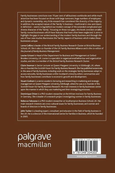 Figures Tables PART I: THE SCHOLARLY VIEW OF THE MODERN FAMILY BUSINESS The Family Business; L.Collins What is the Contribution of the 'Family' to the Modern Business; L.Collins PART II: THE REAL MODERN FAMILY BUSINESS Brothers in Arms: The Story of Thorntons; L.Grisoni , L.Collins & P.Thornton Daughters in Charge; D.Otten Fathers and Daughters; L.Collins , J.Tucker & D.Pierce Brothers in Business: The Pakistani Family Business in the UK; R.Fakoussa & L.Collins Harmonising the Family Business: Deconstructing the DNA of the Family Business; C.Seaman & S.Graham