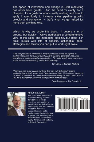 The speed of innovation and change in B2B marketing has never been greater. And the need for clarity, for a blueprint, for a guide to what's really working and how to apply it specifically to increase sales pipeline growth, velocity and conversion - that's what we get asked for more than anything else. Which is why we wrote this book. It covers a lot of ground, but quickly. We've addressed a comprehensive view of the sales and marketing pipeline, but done it in quick bursts with lots of specific, actionable ideas, strategies and tactics you can put to work right away.