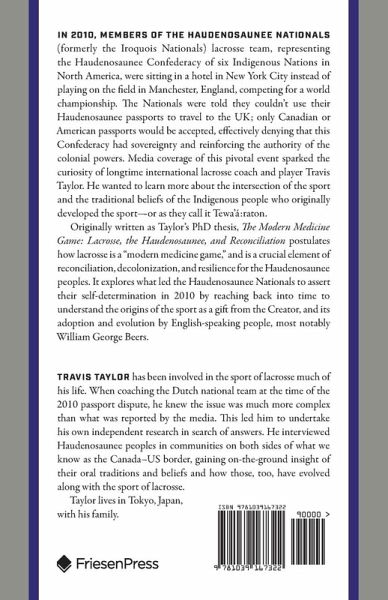 IN 2010, MEMBERS OF THE HAUDENOSAUNEE NATIONALS (formerly the Iroquois Nationals) lacrosse team, representing the Haudenosaunee Confederacy of six Indigenous Nations in North America, were sitting in a hotel in New York City instead of playing on the field in Manchester, England, competing for a world championship. The Nationals were told they couldn't use their Haudenosaunee passports to travel to the UK; only Canadian or American passports would be accepted, effectively denying that this Confederacy had sovereignty and reinforcing the authority of the colonial powers. Media coverage of this pivotal event sparked the curiosity of longtime international lacrosse coach and player Travis Taylor. He wanted to learn more about the intersection of the sport and the traditional beliefs of the Indigenous people who originally developed the sport-or as they call it Tewa'á:raton. Originally written as Taylor's PhD thesis, The Modern Medicine Game: Lacrosse, the Haudenosaunee, and Reconciliation postulates how lacrosse is a "modern medicine game," and is a crucial element of reconciliation, decolonization, and resilience for the Haudenosaunee peoples. It explores what led the Haudenosaunee Nationals to assert their self-determination in 2010 by reaching back into time to understand the origins of the sport as a gift from the Creator, and its adoption and evolution by English-speaking people, most notably William George Beers.
