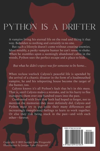 "Memory's haunt conjures the most arrant of ghosts..." Python is a drifter, a vampire living his eternal life on the road and liking it that way. Beholden to nothing and certainly to no one. But such a lifestyle doesn't come without creating enemies. Most notably, a pesky vampire hunter he cant seem to shake. When he stumbles upon a seemingly abandoned cabin the woods, Python sees the perfect escape and a place to hide. But what he didn't expect was for someone to be home... When recluse warlock Calysto's peaceful life is upended by the arrival of a chaotic disaster in the form of a loudmouthed vampire, he and his teleporting house become the target of the hunter, too. >Confronted with lives they both had hoped to forget, not to mention the memories they most definitely did, Calysto and Python must try to put aside their many differences and increasingly complicated feelings to learn to work together. >This is an adult book with themes that are not suitable for minors. Content warnings are included before the title page, available for view within the sample.