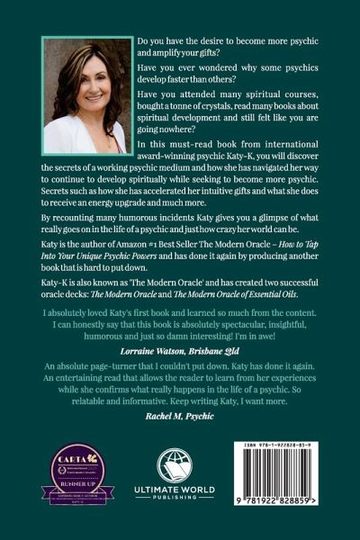 Do you have the desire to become more psychic and amplify your gifts? Have you ever wondered why some psychics develop faster than others? Have you attended many spiritual courses, bought a tonne of crystals, read many books about spiritual development and still felt like you are going nowhere? In this must-read book from international award-winning psychic Katy-K, you will discover the secrets of a working psychic medium and how she has navigated her way to continue to develop spiritually while seeking to become more psychic. Secrets such as how she has accelerated her intuitive gifts and what she does to receive an energy upgrade and much more. By recounting many humorous incidents Katy gives you a glimpse of what really goes on in the life of a psychic and just how crazy her world can be. Katy is the author of Amazon #1 Best Seller The Modern Oracle - How to Tap Into Your Unique Psychic Powers and has done it again by producing another book that is hard to put down. Katy-K is also known as 'The Modern Oracle' and has created two successful oracle decks: The Modern Oracle and The Modern Oracle of Essential Oils. I absolutely loved Katy's first book and learned so much from the content. I can honestly say that this book is absolutely spectacular, insightful, humorous and just so damn interesting! I'm in awe! Lorraine Watson Brisbane Qld An absolute page-turner that I couldn't put down. Katy has done it again. An entertaining read that allows the reader to learn from her experiences while she confirms what really happens in the life of a psychic. So relatable and informative. Keep writing Katy, I want more. Rachel M Psychic
