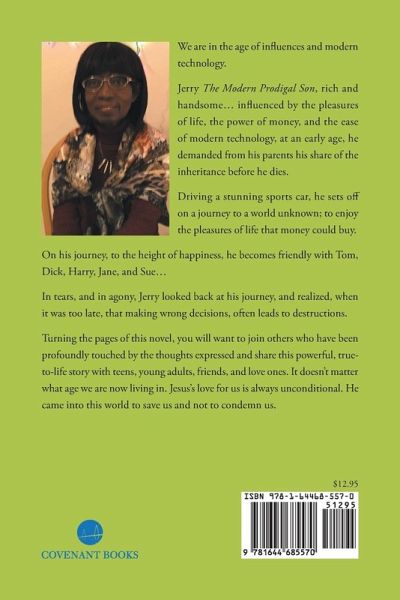 We are in the age of influences and modern technology. Jerry The Modern Prodigal Son, rich and handsome... influenced by the pleasures of life, the power of money, and the ease of modern technology, at an early age, he demanded from his parents his share of the inheritance before he dies. Driving a stunning sports car, he sets off on a journey to a world unknown; to enjoy the pleasures of life that money could buy. On his journey, to the height of happiness, he becomes friendly with Tom, Dick, Harry, Jane, and Sue... In tears, and in agony, Jerry looked back at his journey, and realized, when it was too late, that making wrong decisions, often leads to destructions. Turning the pages of this novel, you will want to join others who have been profoundly touched by the thoughts expressed and share this powerful, true-to-life story with teens, young adults, friends, and love ones. It doesn't matter what age we are now living in. Jesus's love for us is always unconditional. He came into this world to save us and not to condemn us.