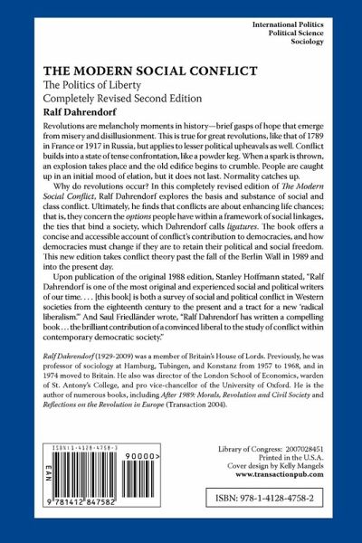 Revolutions are melancholy moments in history-brief gasps of hope that emerges from misery and disillusionment. This is true for great revolutions, like 1789 in France or 1917 in Russia, but applies to lesser political upheavals as well. Conflict builds into a state of tense confrontation, like a powder keg. When a spark is thrown, an explosion takes place and the old edifice begins to crumble. People are caught up in an initial mood of elation, but it does not last. Normality catches up. Why do revolutions occur? In this completely revised edition of The Modern Social Conflict, Ralf Dahrendorf explores the basis and substance of social and class conflict. Ultimately, he finds that conflicts are about enhancing life chances; that is, they concern the options people have within a framework of social linkages, the ties that bind a society, which Dahrendorf calls ligatures. The book offers a concise and accessible account of conflict's contribution to democracies, and how democracies must change if they are to retain their political and social freedom. This new edition takes conflict theory past the fall of the Berlin Wall in 1989 and into the present day. Upon publication of the original 1988 edition, Stanley Hoffmann stated, "Ralf Dahrendorf is one of the most original and experienced social and political writers of our time. . . . [this book] is both a survey of social and political conflict in Western societies from the eighteenth century to the present and a tract for a new'radical liberalism.'" And Saul Friedlander wrote, "Ralf Dahrendorf has written a compelling book . . . the brilliant contribution of a convinced liberal to the study of conflict within contemporary democratic society."