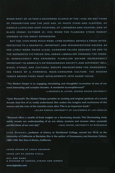 Lynn Dumenil's The Modern Temper provides a unique perspective into the American Jazz Age. When most of us take a backward glance at the 1920s, we may think of prohibition and the jazz age, of movies stars and flappers, of Harold Lloyd and Mary Pickford, of Lindbergh and Hoover--and of Black Friday, October 29, 1929, when the plunging stock market ushered in the great depression. But the 1920s were much more. Lynn Dumenil brings a fresh interpretation to a dramatic, important, and misunderstood decade. As her lively work makes clear, changing values brought an end to the repressive Victorian era; urban liberalism emerged; the federal bureaucracy was expanded; pluralism became increasingly important to America's heterogeneous society; and different religious, ethnic, and cultural groups encountered the homogenizing force of a powerful mass-consumer culture. The Modern Temper brings these many developments into sharp focus.