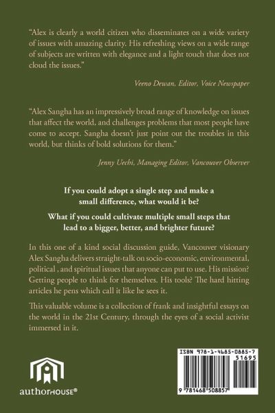 "Alex is clearly a world citizen who disseminates on a wide variety of issues with amazing clarity. His refreshing views on a wide range of subjects are written with elegance and a light touch that does not cloud the issues." Veeno Dewan, Editor, Voice Newspaper "Alex Sangha has an impressively broad range of knowledge on issues that affect the world, and challenges problems that most people have come to accept. Sangha doesn't just point out the troubles in this world, but thinks of bold solutions for them." Jenny Uechi, Managing Editor, Vancouver Observer If you could adopt a single step and make a small difference, what would it be? What if you could cultivate multiple small steps that lead to a bigger, better, and brighter future? In this one of a kind social discussion guide, Vancouver visionary Alex Sangha delivers straight-talk on socio-economic, environmental, political, and spiritual issues that anyone can put to use. His mission? Getting people to think for themselves. His tools? The hard hitting articles he pens which call it like he sees it. This valuable volume is a collection of frank and insightful essays on the world in the 21st Century, through the eyes of a social activist immersed in it.