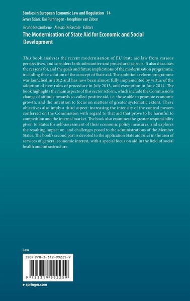 Introduction: The Modernization of State Aid Regulation - Bruno Nascimbene.- Part I A New Institutional Framework for State Aid Control.- State Aid Modernization - Nicola Pesaresi and Rodrigo Peduzzi.- The Notice on the Notion of State Aid: Every Light Has Its Shadow - Andrea Biondi and Oana Stefan.- A More Economic Approach to the Control of State Aid - Phedon Nicolaides.- State Aid Control: Are the Standards Adopted and the Institutional Setting in Place Appropriate? - Alberto Heimler.- Part II Policy Areas.- Services of General Economic Interest - Erika Szyszczak.- Infrastructure Financing and State Aid Control: The Potential for a Virtuous Relationship - Ginevra Bruzzone and Marco Boccaccio.- Tasks for National Authorities in the Modernization Era: A Case Study-Italy - Valerio Vecchietti.- Energy and Environment - Massimo Merola and Omar Diaz.- Public Policies for Financing the Deployment of Broadband and Very High-Speed Broadband Networks and EU Rules on State Aid Control - Mario Siragusa and G. Cesare Rizza.- State Aids, Social Services and Healthcare in EU Law - Daniele Gallo.
