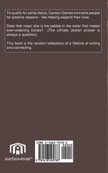 In this volume, Carolyn Gaines' definition of the Yiddish word Yenta differs somewhat from Leo Rosten's in his book, Hooray for Yiddish. It is more like the marriage broker in Fiddler on the Roof (whose name was Yenta). To qualify for Yenta status, she believes one needs to be interested in people - connecting them for positive reasons like helping expand their lives. Does that make her the pebble in the water that makes ever-widening circles? (The ultimate Jewish remark is always a question). This book, then, is the random reflections of a lifetime of writing and joining.
