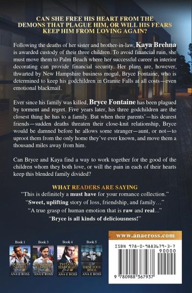 Can she free his heart from the demons that plague him, or will his fears keep him from loving again? Following the deaths of her sister and brother-in-law, Kaya Brehna is awarded custody of their three children. To avoid financial ruin, she must move them to Palm Beach where her successful career in interior decorating can provide financial security. Her plans are, however, thwarted by New Hampshire business mogul, Bryce Fontaine, who is determined to keep his godchildren in Granite Falls at all costs-even emotional blackmail. Ever since his family was killed, Bryce Fontaine has been plagued by torment and regret. Five years later, his three godchildren are the closest thing he has to a family. But when their parents'-his dearest friends-sudden deaths threaten their close-knit relationship, Bryce would be damned before he allows some stranger-aunt, or not-to uproot them from the only home they've ever known, and move them a thousand miles away from him. Can Bryce and Kaya find a way to work together for the good of the children whom they both love, or will the pain in each of their hearts keep this blended family divided?