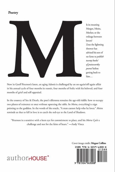 Is its meaning Margot, Moira, Mother, or the mileage between lovers? Zeus the lightning thrower has advised his son of no fame to publish twenty books/of praiseworthy poems/ before getting back to him... Now in Geoff Peterson's latest, an aging Adonis is challenged by an on-again/off-again affair in his annual cycle of four months in transit, four months of frolic with his beloved, and four months of grief and self-appraisal. In the country of Sex & Death, the poet's dilemma remains the age-old riddle: how to occupy two planes of existence at once without upsetting the table. In Moira, everything's a sign pointing to the goddess. In the words of the oracle, "A man cannot help who he loves." Moira reminds us that to fall in love is to catch the red-eye to the Land of Shadows. "Peterson is a sensitive with a keen eye for commitment to place, and his Moira Cycle a challenge and not for the faint of heart." -Andy Vinca